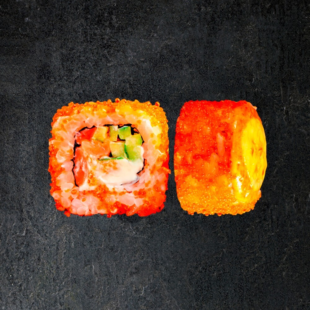 Рис, лосось, крем-сыр, огурец, икра масаго, спайси соус, соус нежный чили. (8 шт).
