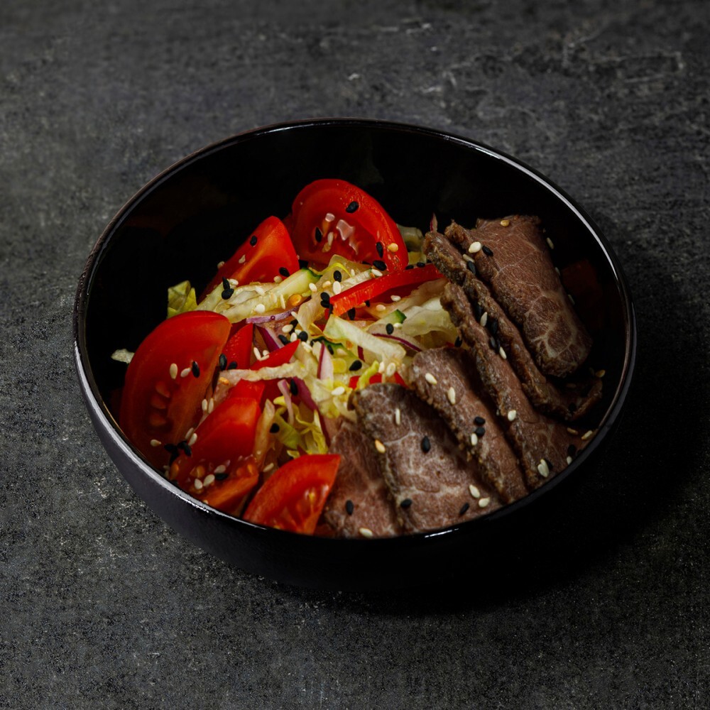 Айсберг, огурец, перец сладкий, помидоры черри, говядина су-вид, соус австралийский, лук красный, кунжут.