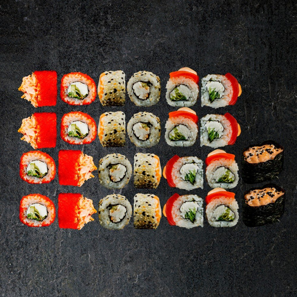Ролл Тартар с крабом, ролл Чикен чиз, Гункан с тунцом 2 шт., ролл Два вкуса. (26 шт).