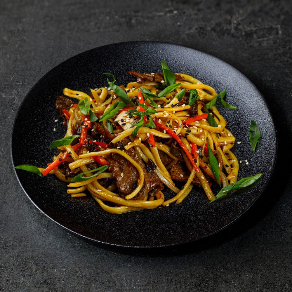 Удон (лапша пшеничная домашняя), говядина, лук репчатый, морковь, шампиньоны, грибы древесные, перец сладкий, имбирно-чесночная смесь, соус тайский лук зеленый, кунжут.