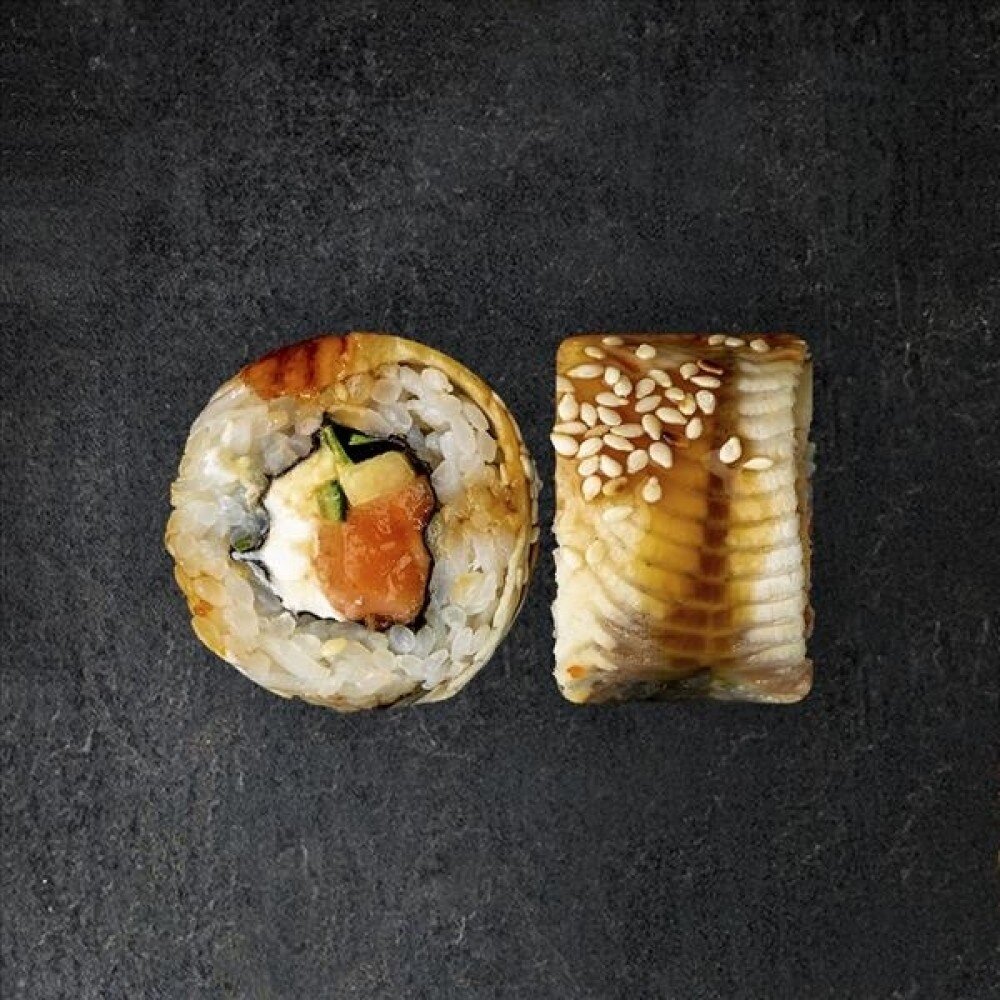 Рис, угорь, лосось, нори, крем-сыр, огурец, соус унаги, кунжут (8шт).