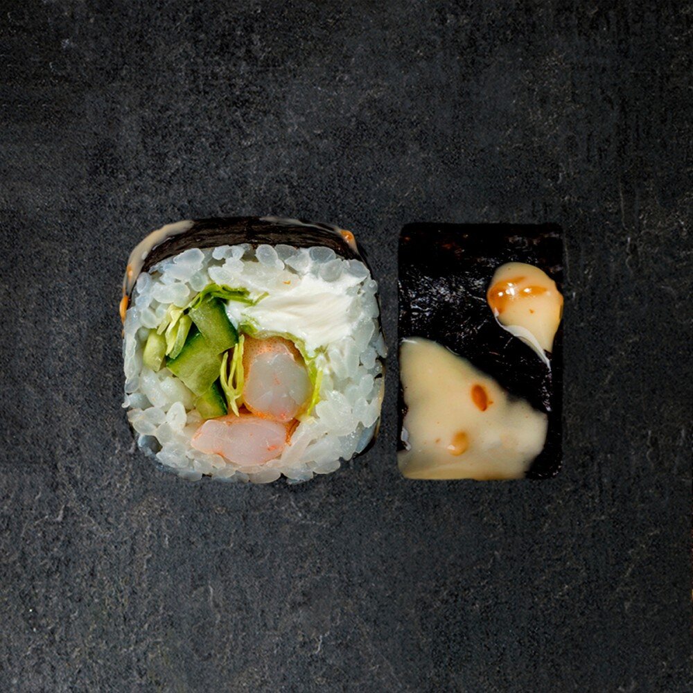 Рис, креветка, нори, крем-сыр, огурец, айсберг, соус нежный чили (8шт).
