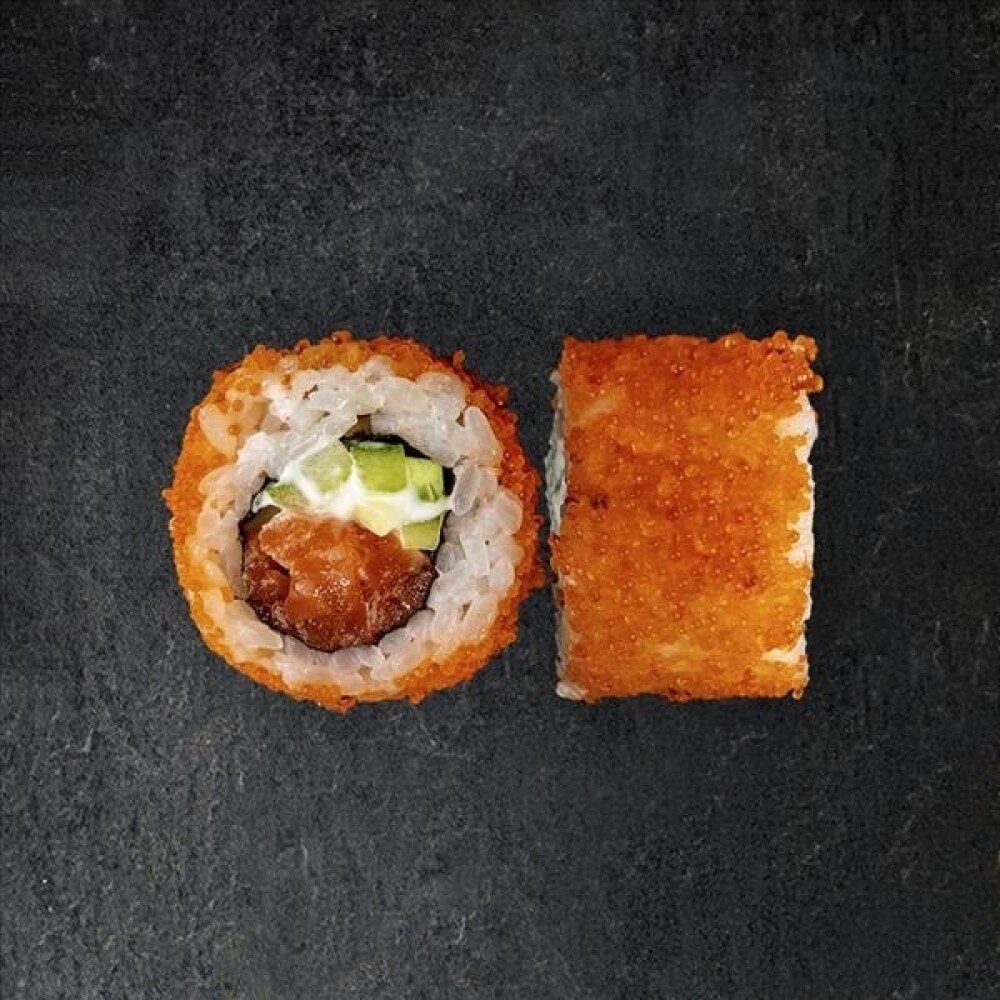 Рис, лосось, икра масаго, майонез, огурец, нори (8шт).