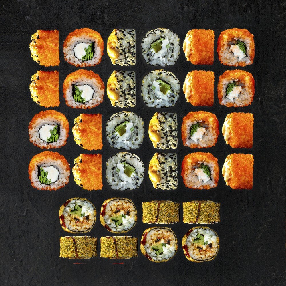 Ролл Кани с анананасом кимчи, ролл Запеченный с лососем и окунем, ролл Темпура краб и угорь, ролл Запеченный эби (32шт).