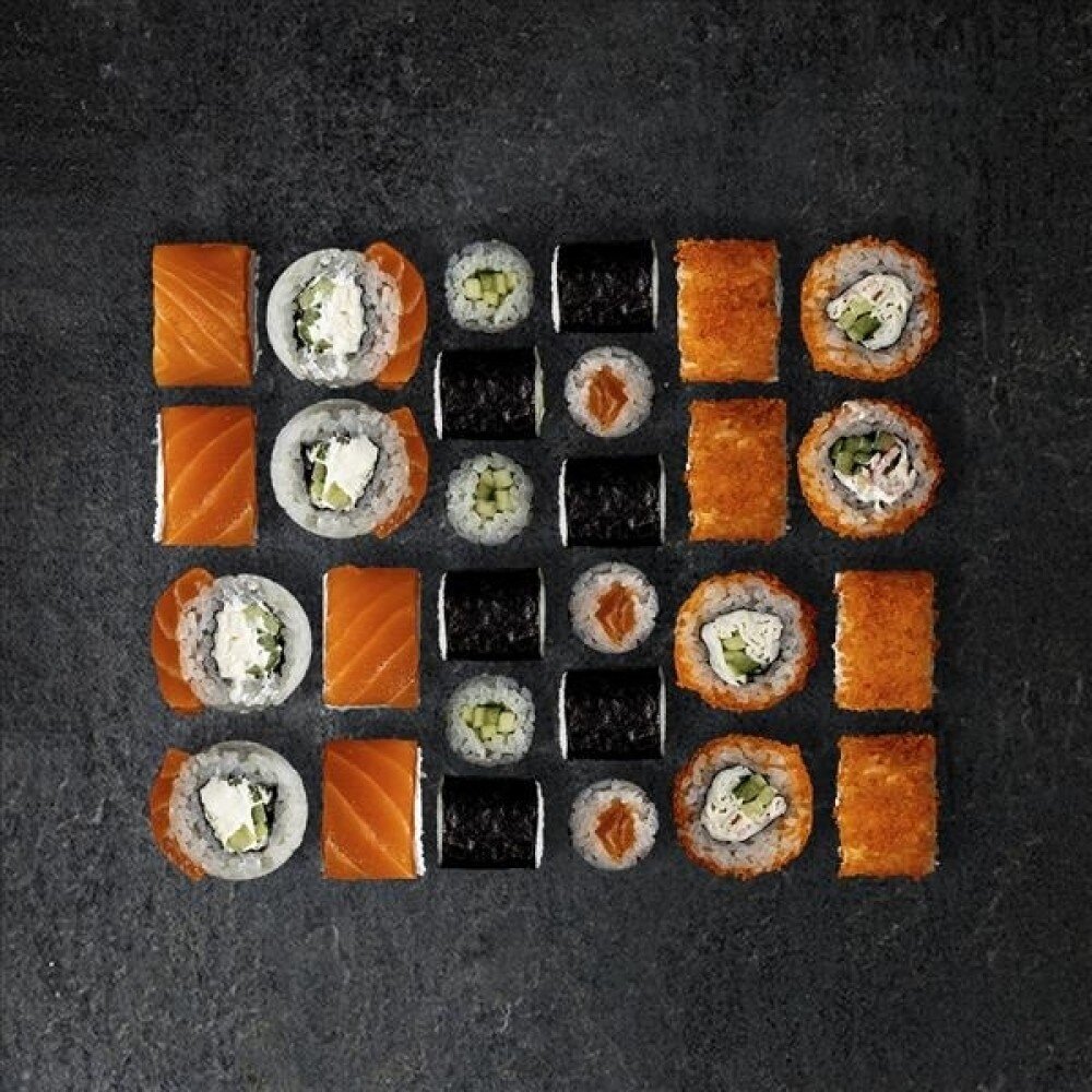 Ролл Лосось, ролл Огурец, ролл Калифорния, ролл Филадельфия. (28 шт).