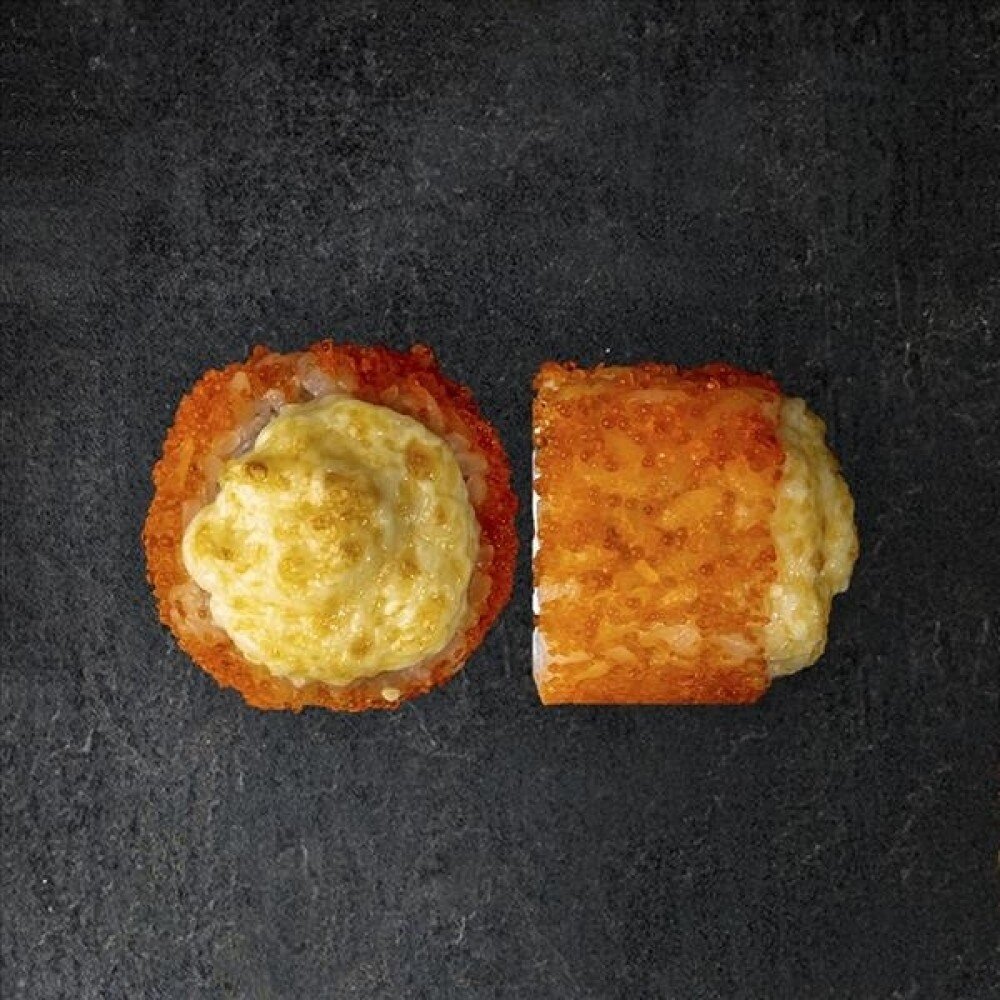 Рис, креветка, нори, крем-сыр, огурец, икра масаго, соус нежный (8 шт).