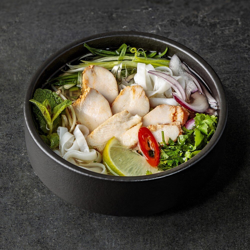 Говяжий бульон, рисовая лапша фо, курица су-вид, лук красный, ростки бобов, перец чили, лайм, соус уксусный, соус острый фо, мята, кинза, лук зеленый.