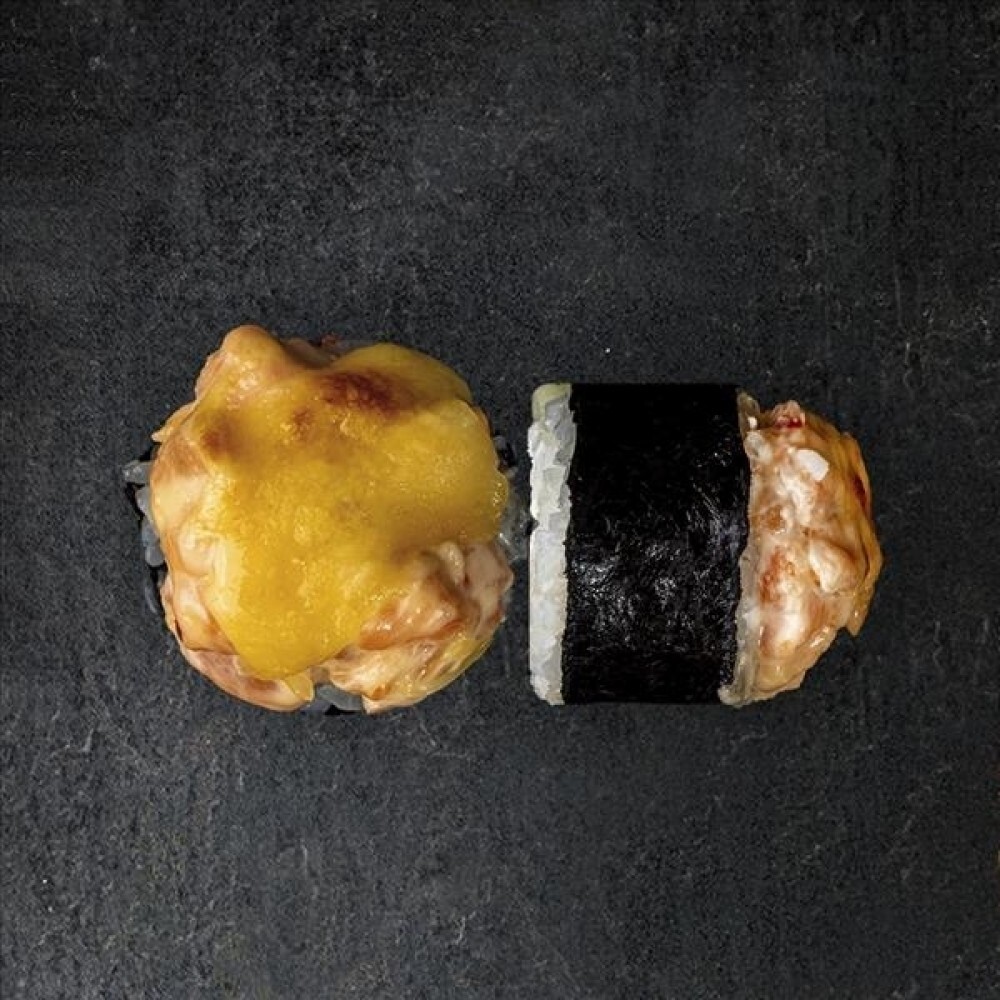 Рис, лосось, нори, крем-сыр, огурец, соус нежный чили, кунжут, сыр твердый, (8 шт).