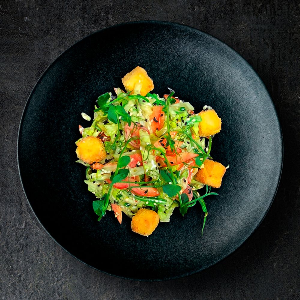 Айсберг, огурец, водоросли чукка, перец сладкий, черри, сыр тофу, крахмал кукурузный, соус австралийский, кунжут, микрозелень, лайм, перец чили, специи шичими.