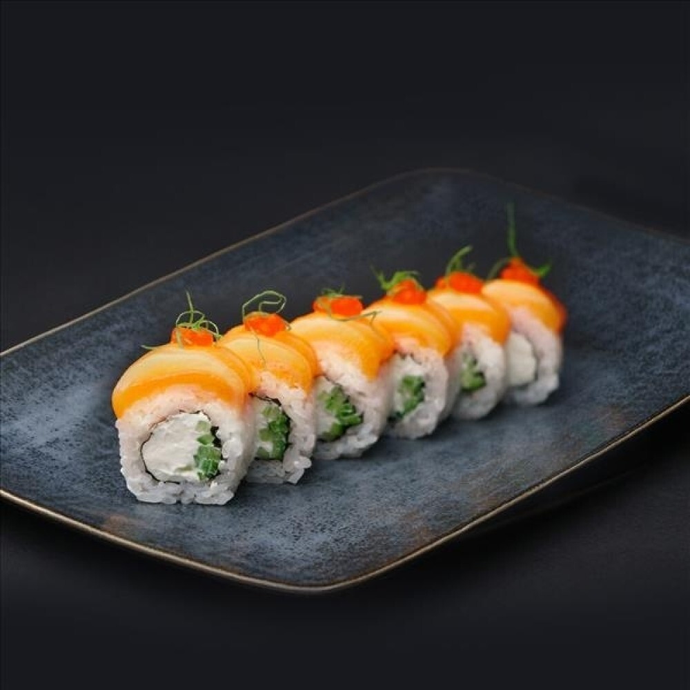 Рис, нори, творожный сыр, лосось, огурец, икра