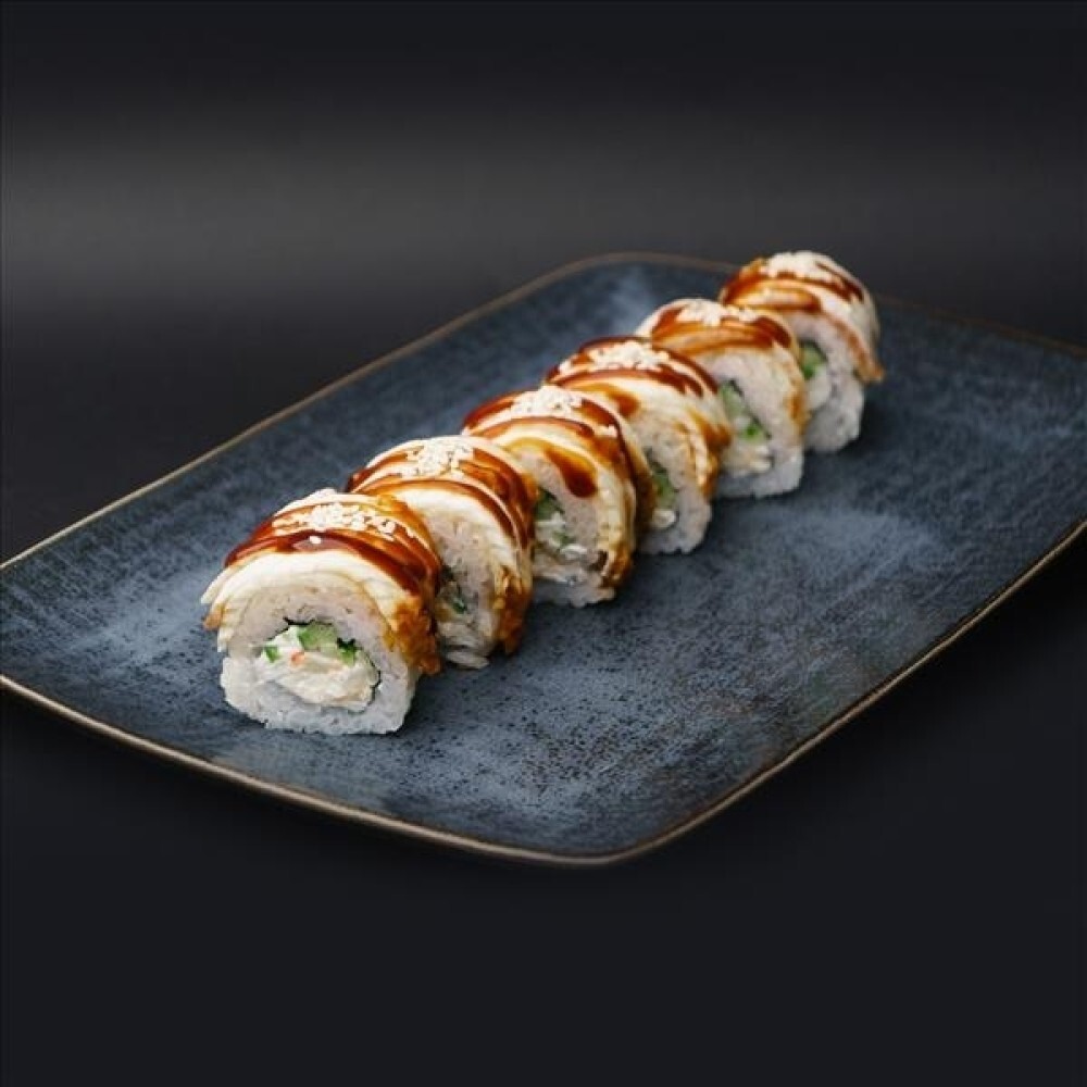 Рис, нори, творожный сыр, краб, огурец, угорь, соус унаги, кунжут