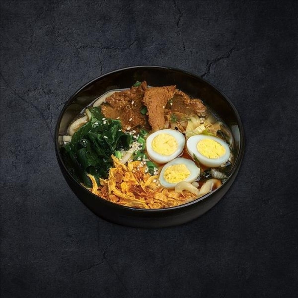 Бульон рамен, лапша удон домашняя, свинина, яйцо маринованное, водоросли вакаме, лук криспи, лук зелёный