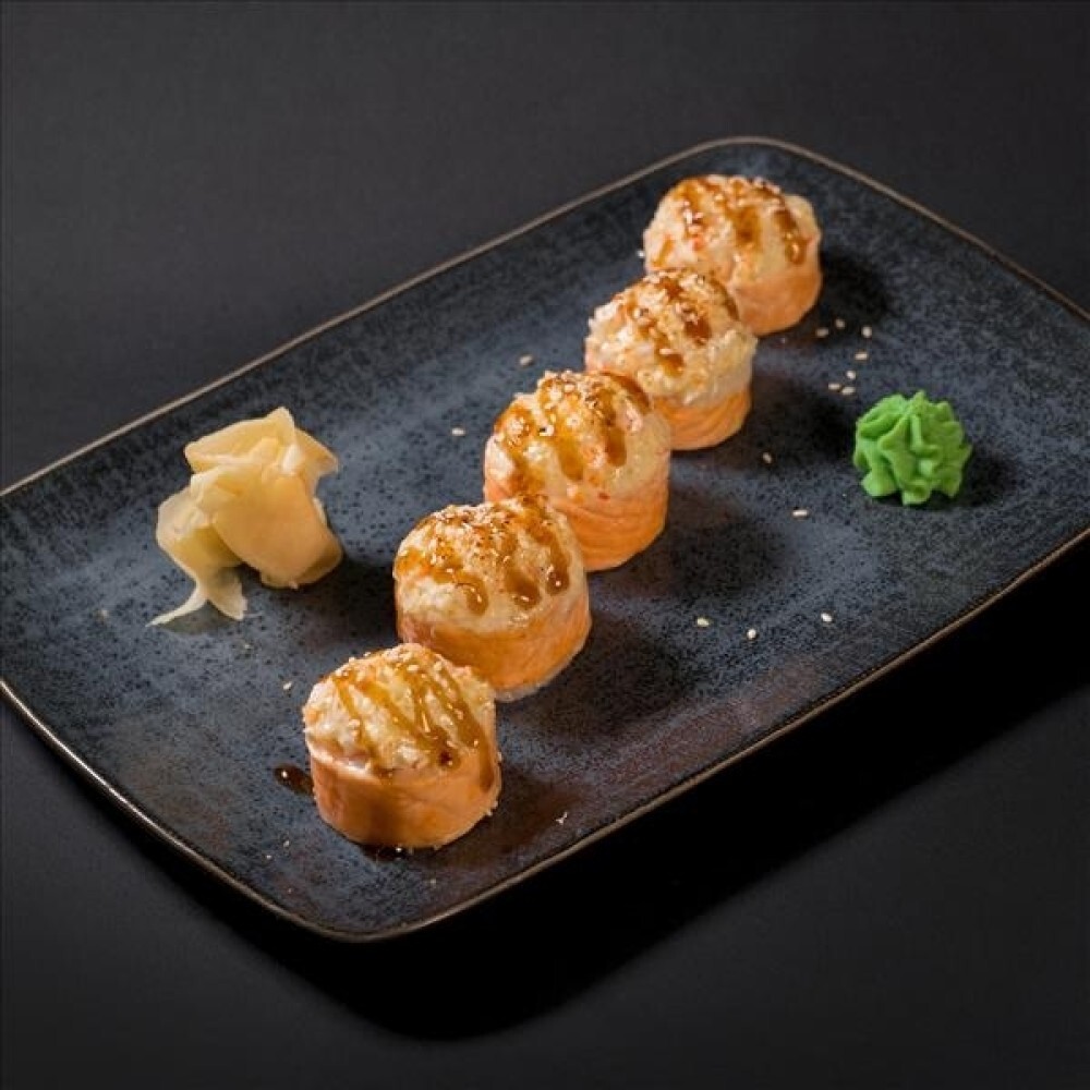 рис, нори, лосось, креветка, творожный сыр, майонез, краб, соус унаги, кунжут