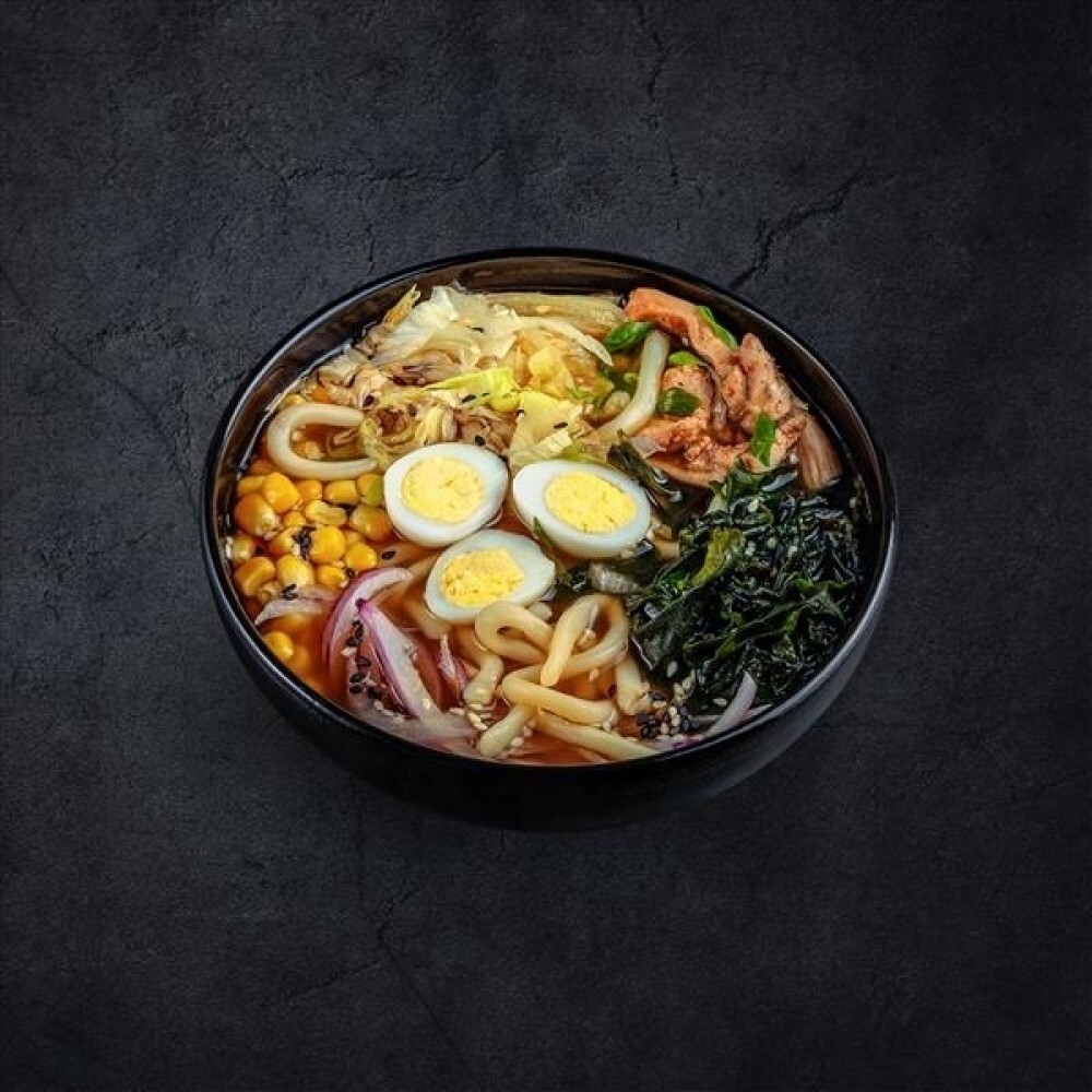 Бульон рамен, лапша удон домашняя, мясо куриное, яйцо маринованное, водоросли вакаме, кукуруза консервированная, лук зеленый, айсберг, лук красный