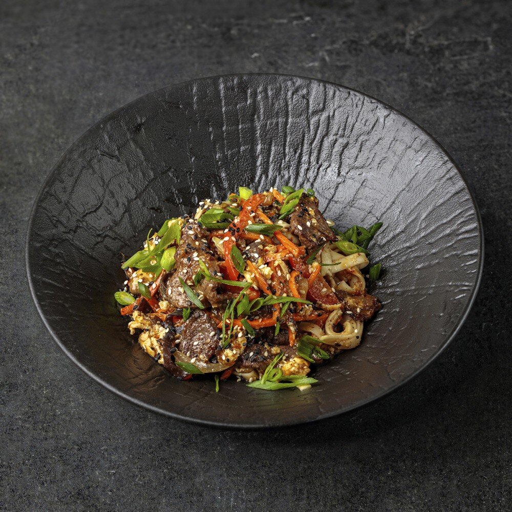 Удон (лапша пшеничная домашняя), говядина, лук репчатый, морковь, шампиньоны, грибы древесные, перец сладкий, соус бонито, лук зеленый, кунжут, яйцо куриное.