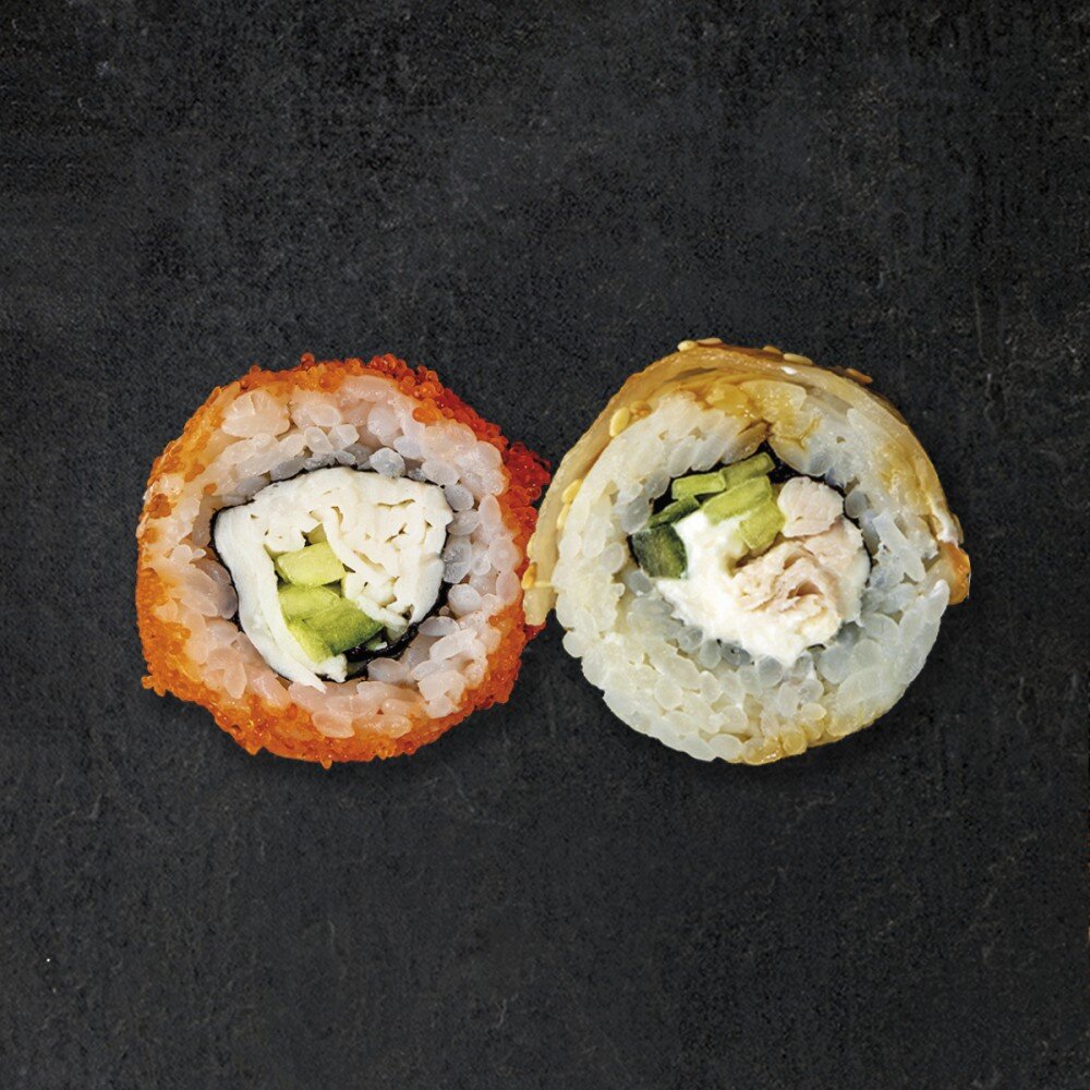 Рис, снежный краб, огурец, крем-сыр, икра масаго, нори, соус нежный чили, угорь, кунжут белый (8шт).