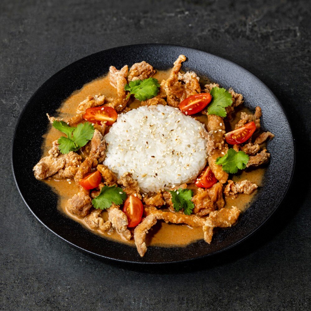 Рис, мясо курицы, соус том ям, кинза, помидор черри, кунжут