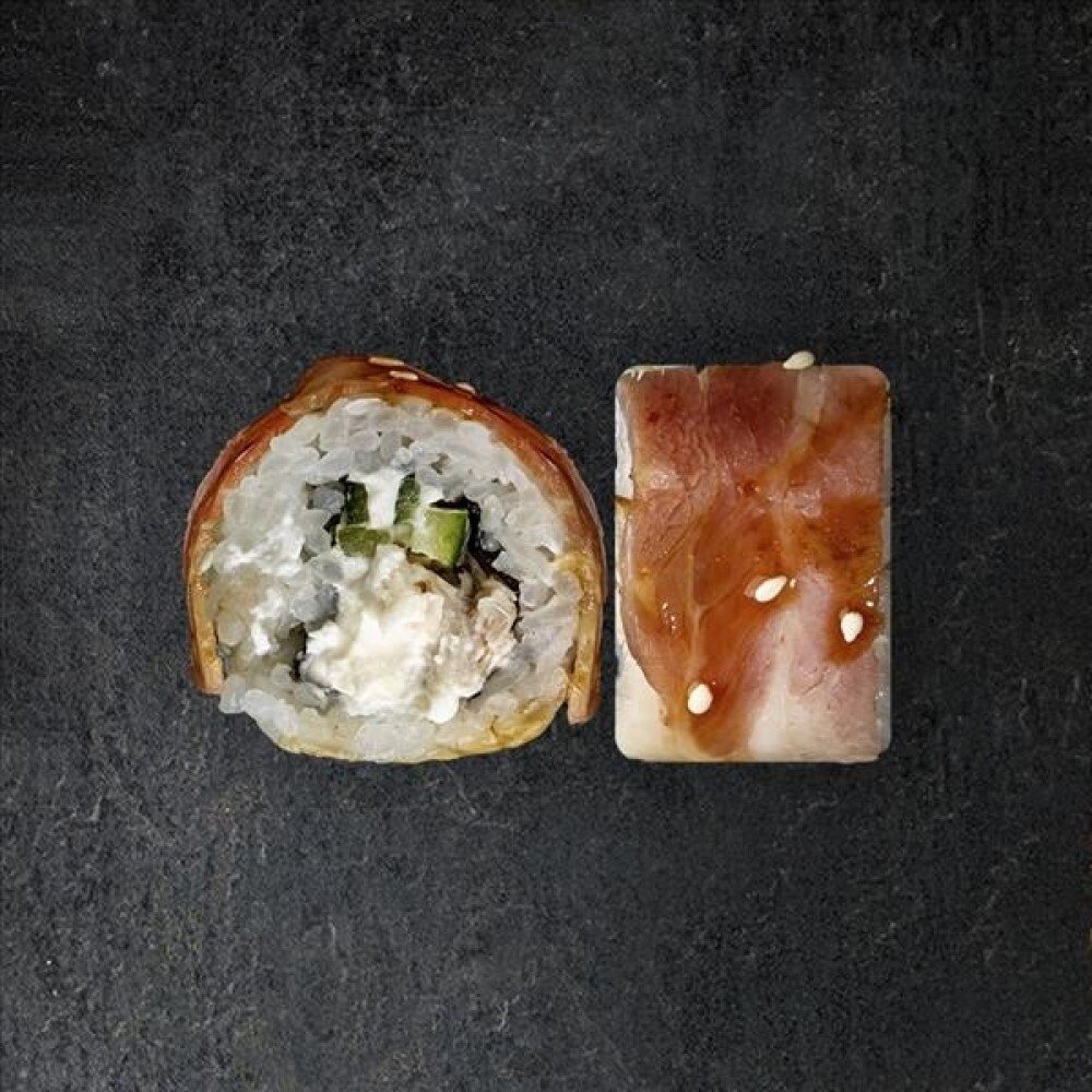 Рис, бекон, курица копченая, нори, крем-сыр, огурец, соус терияке, кунжут (8 шт).