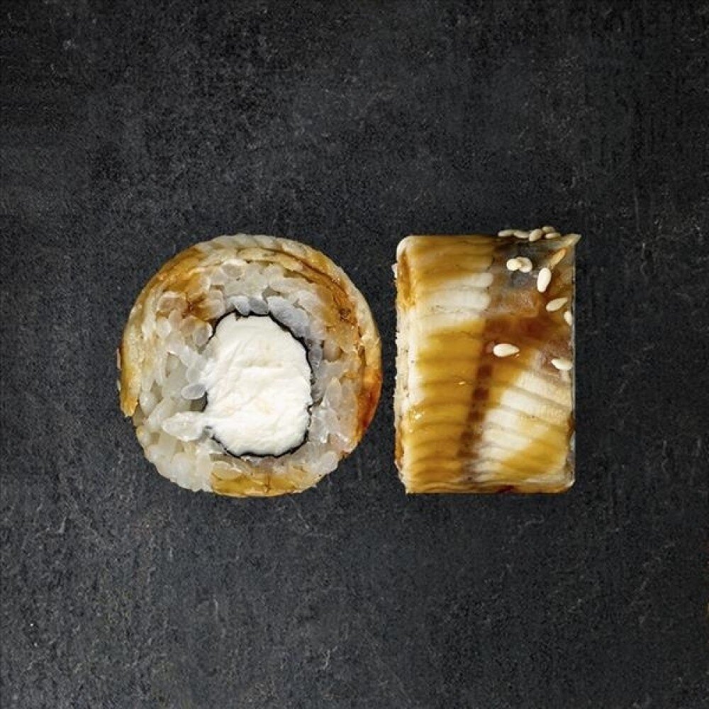 Рис, крем-сыр, угорь, нори, кунжут, соус унаги. (8шт).