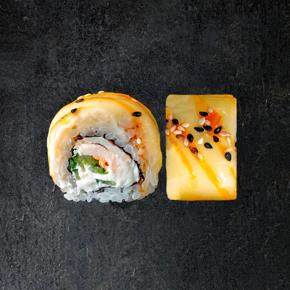 Рис, нори, сыр сливочный, курица су-вид, крем-сыр, огурец, соус терияки, кунжут (8 шт).