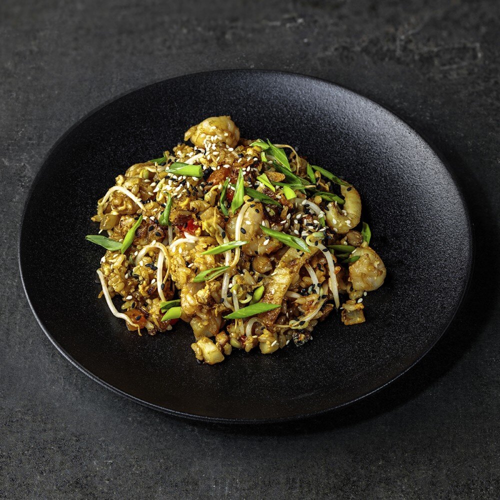 Рис, креветки, кальмар, перец сладкий, лук репчатый, шампиньоны, имбирно-чесночная смесь, кунжутное масло, яйцо куриное, соус терияки, соус ми хай сан, маш проростки, лук зеленый, кунжут.