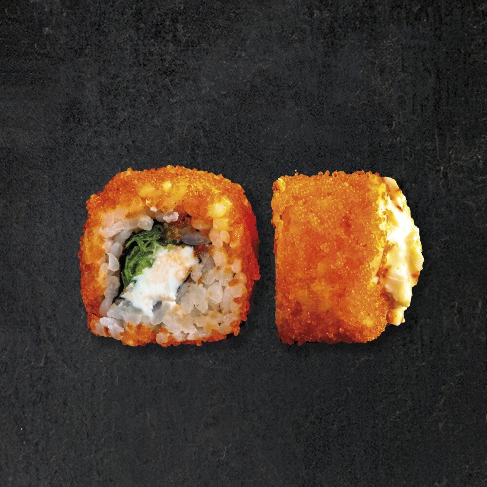 Рис, снежный краб, нори, айсберг, крем-сыр, ананас кимчи, икра масага, соус нежный чили (8шт).
