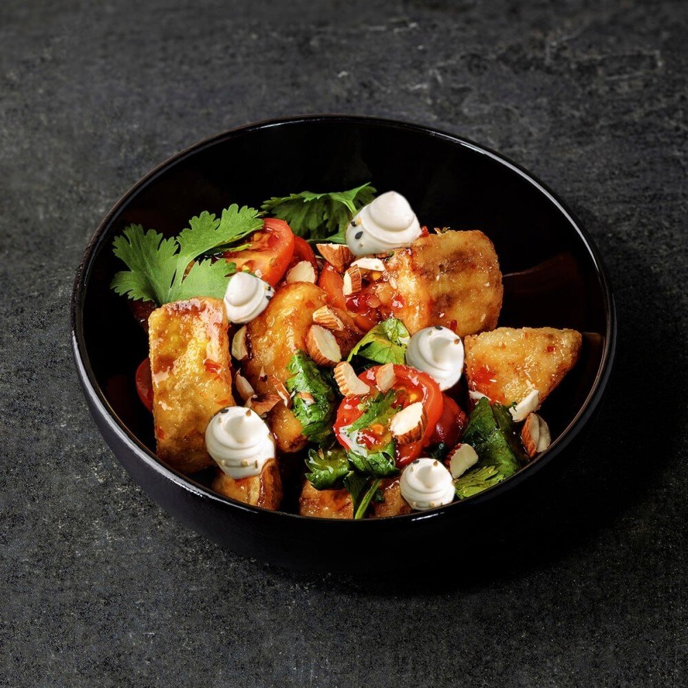 Баклажан, помидоры черри, крахмал кукурузный кинза, орех миндаль, соус свит чили, сырный мусс.