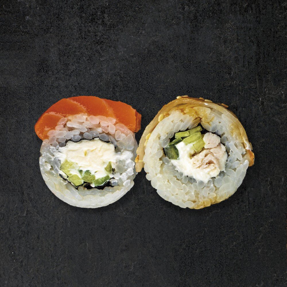 Рис, лосось, огурец, крем-сыр, нори, угорь, снежный краб, соус нежный чили, икра масаго, кунжут белый (8шт).