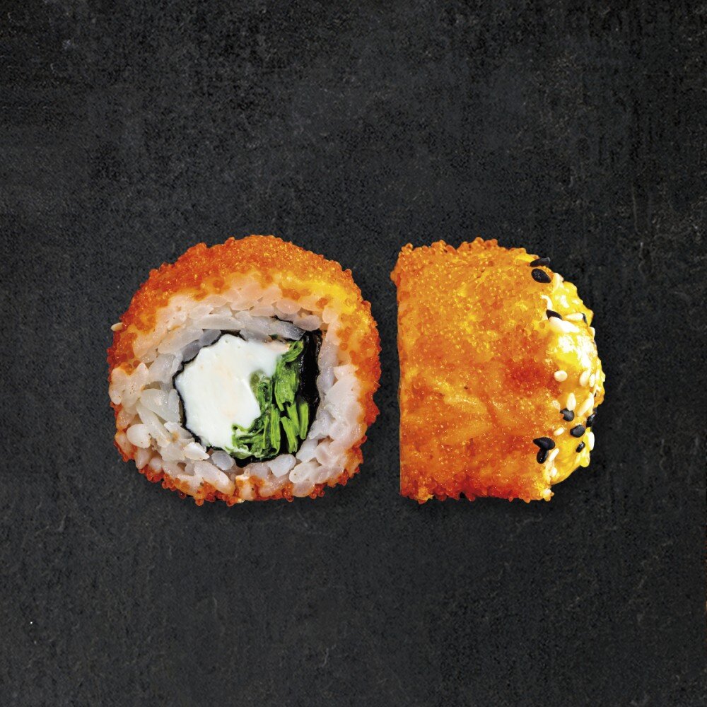 Рис, креветки, нори, соус нежный чили, сыр твердый, соус кимчи, айсберг, икра масаго, соус унаги, кунжут (8шт).