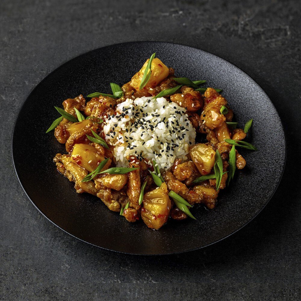 Соус азиатский, кунжут, лук зеленый, лайм, рис, курица, ананас кимчи.
