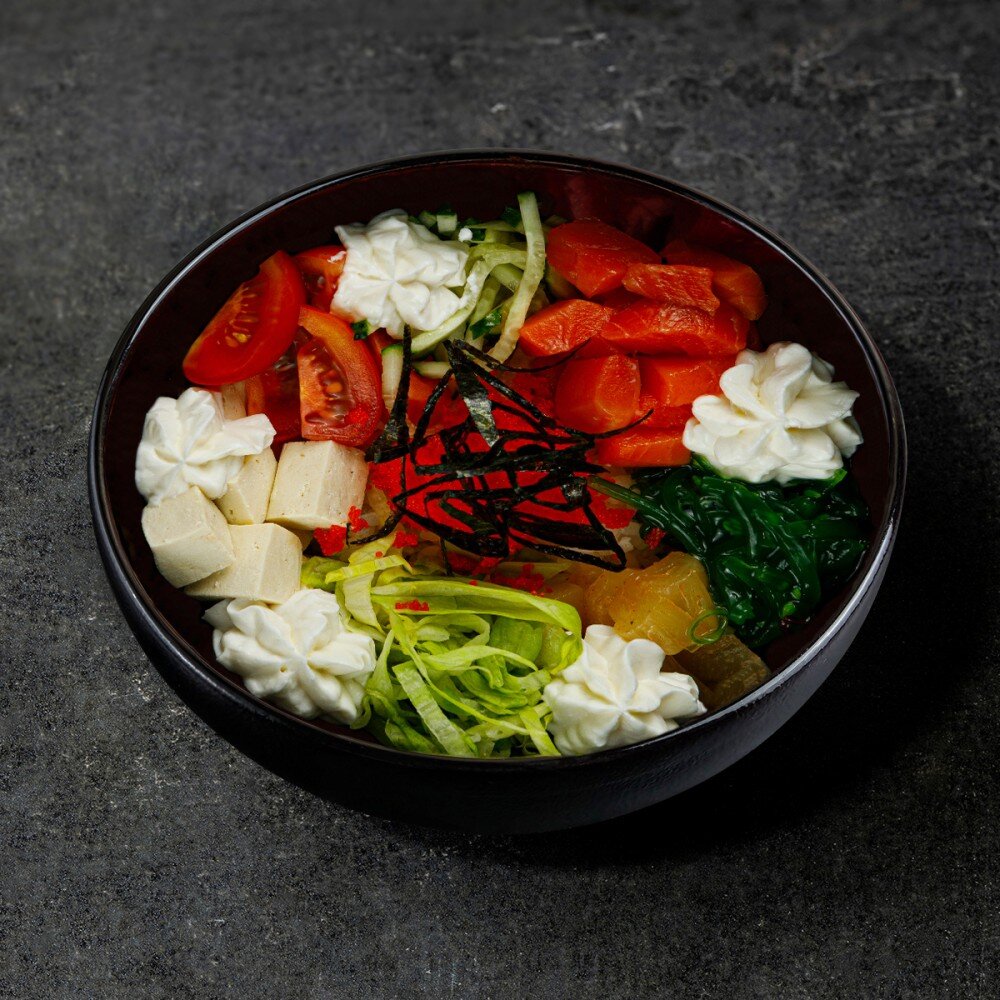 Рис, лосось с/с, водоросли чукка, огурец, айсберг, сыр тофу, помидоры черри, ананас маринованный, водоросли нори, соус австралийский, икра масаго, сырный мусс.