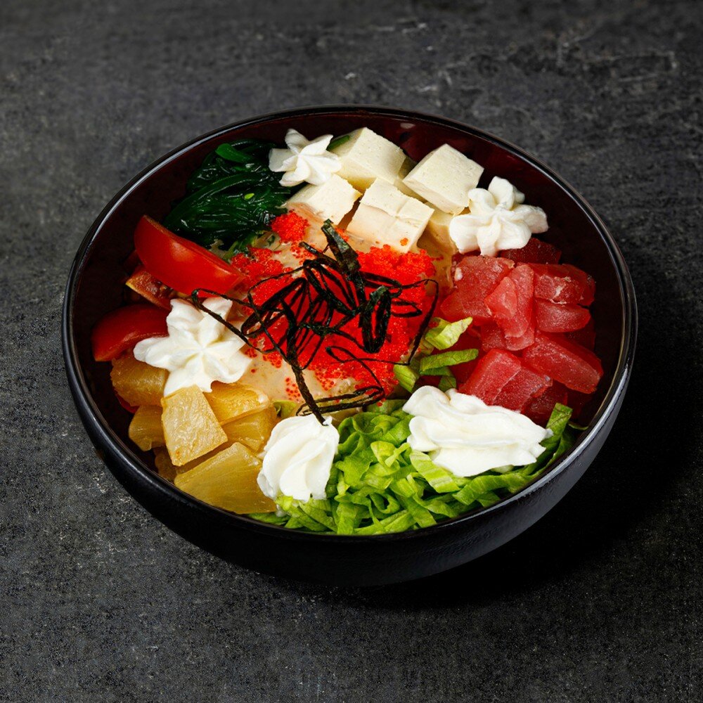 Рис, тунец, водоросли чукка, огурец, айсберг, сыр тофу, помидоры черри, ананас маринованный, водоросли нори, соус австралийский, икра масаго, сырный мусс.