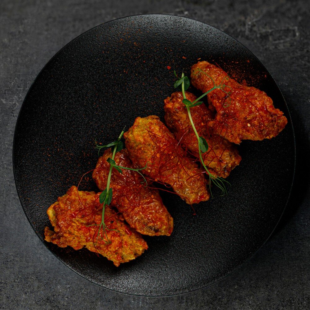 Куриные крылья, паприка, соевый соус, кляр, сухари панировочный, соус чили сладкий, соус шрирача, специи шичими, перец чили. (5 шт.)