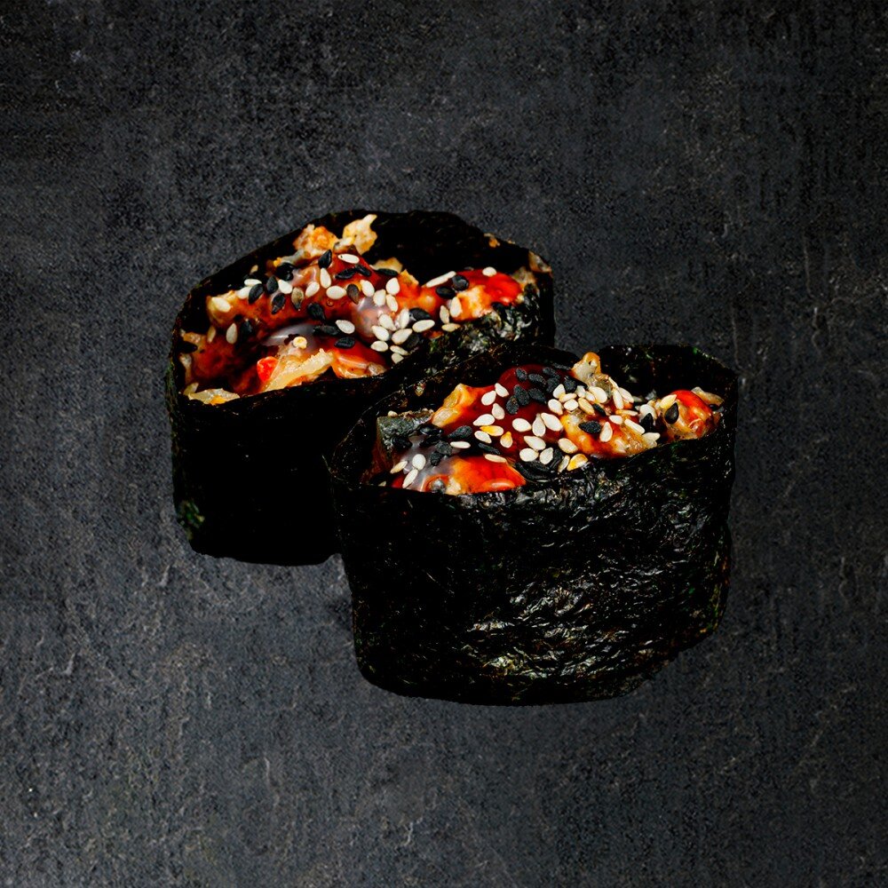 Рис, угорь, нори, соус унаги, кунжут, соус нежный чили.
