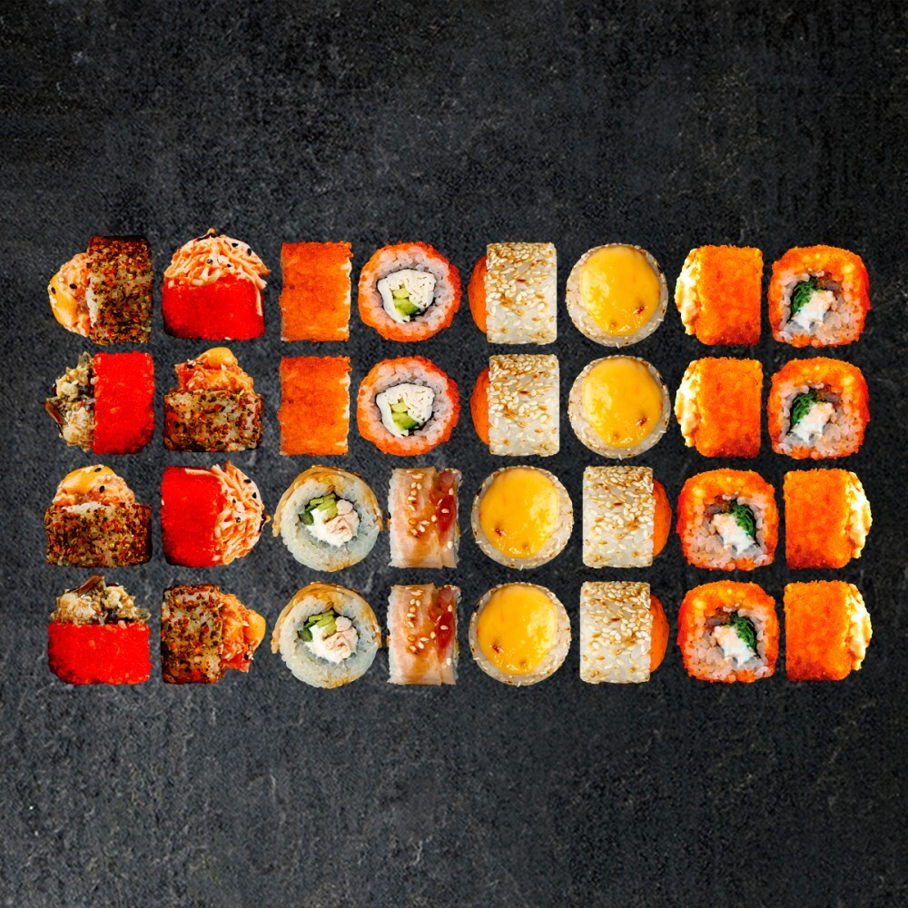 Ролл 4 вкуса, ролл Калифорния/дракон, ролл Балдеж, ролл Парагвай. (32 шт)