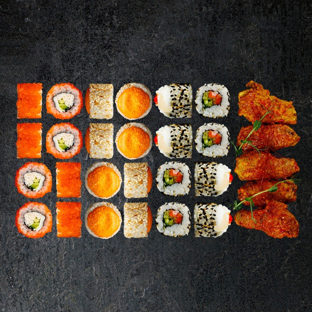 Ролл Калифорния, ролл Сливочный краб, ролл Павлова, Куриные крылья чили.