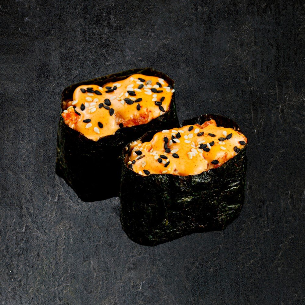 Рис, лосось, нори, сыр моцарелла, соус спайси, соус нежный чили, кунжут.
