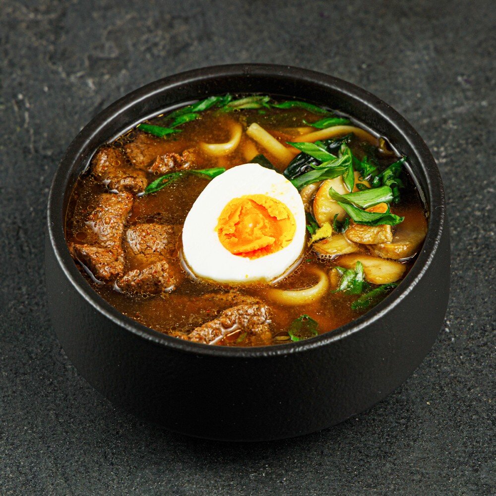 Говяжий мисо бульон, лапша удон, говядина, шампиньоны, соус тарэ, яйцо куриное мариннованное, лук зеленый, водоросли вакамэ.