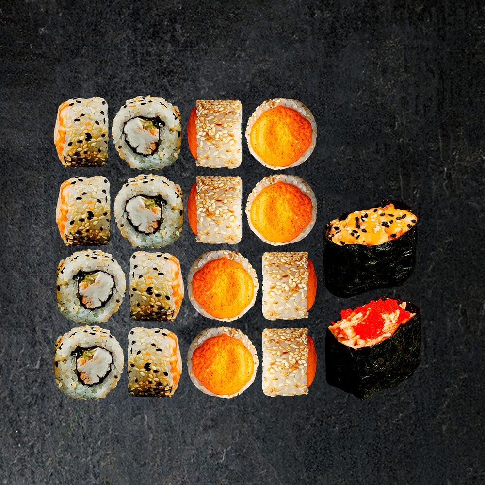 Чикен чиз, сливочный краб, гункан с крабом 1шт, гункан с лососем 1шт. (18 шт)